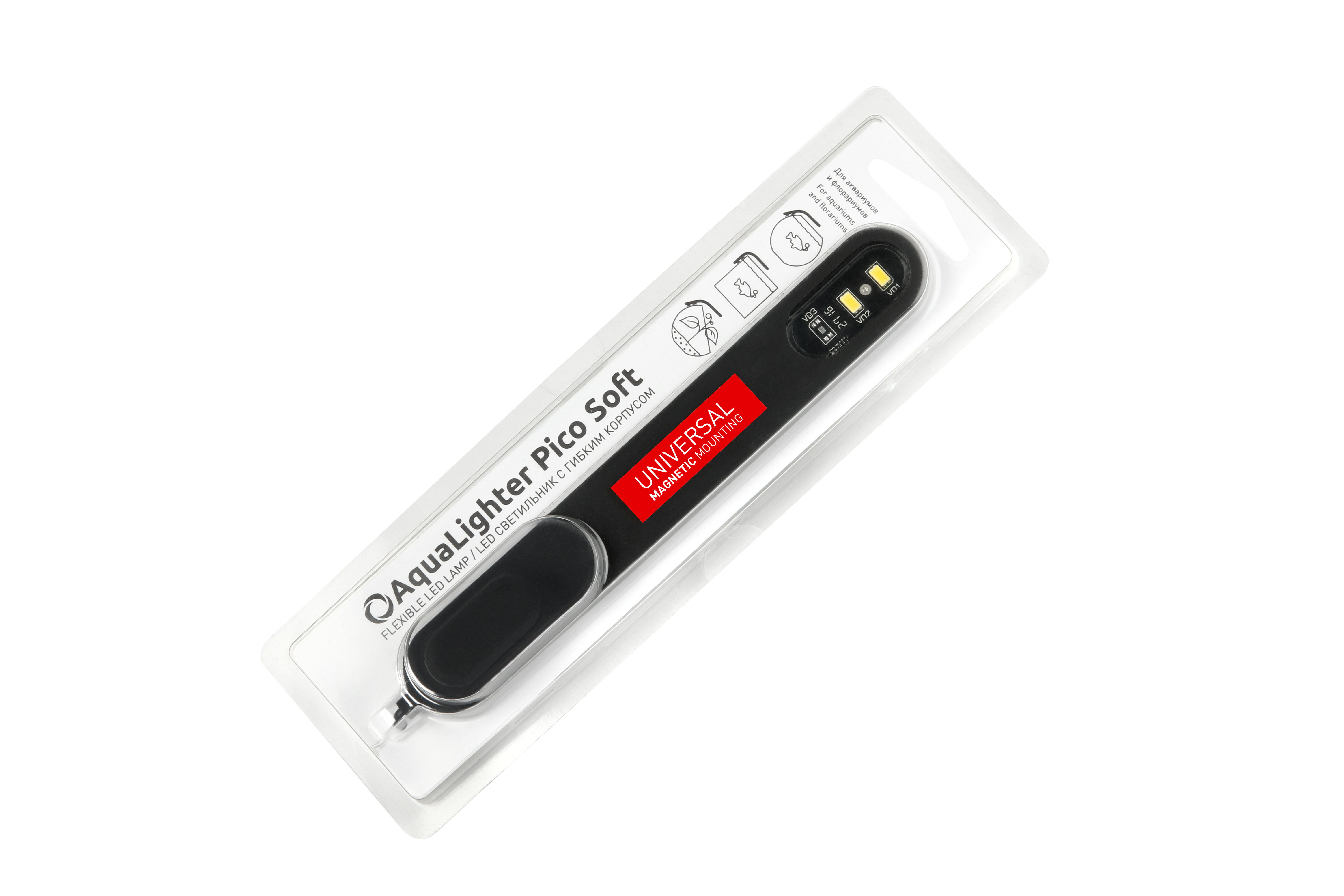 - Универсальный. Гибкий корпус позволяет разместить светильник на аквариумах любой формы.