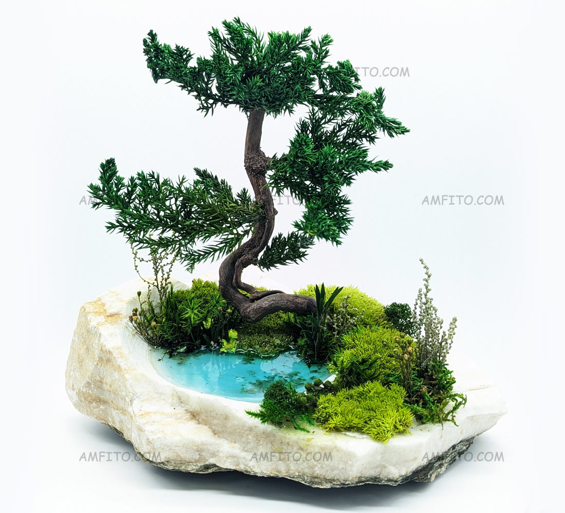 Композиция на фото: дерево из стабилизированного мха на настоящем камне.