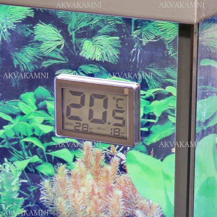 - Цифровой аквариумный термометр показывает температуру воды в диапазоне 0-37°C с шагом 0,1°C. Предустановленный сигнал срабатывает при температуре <18 и >28°C