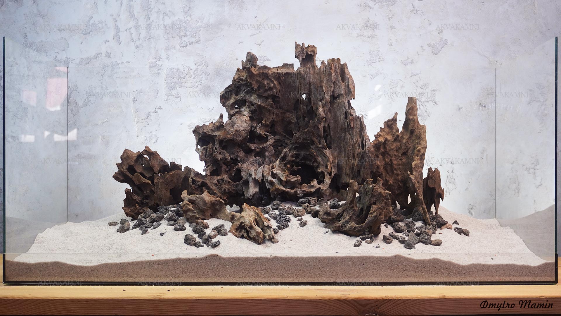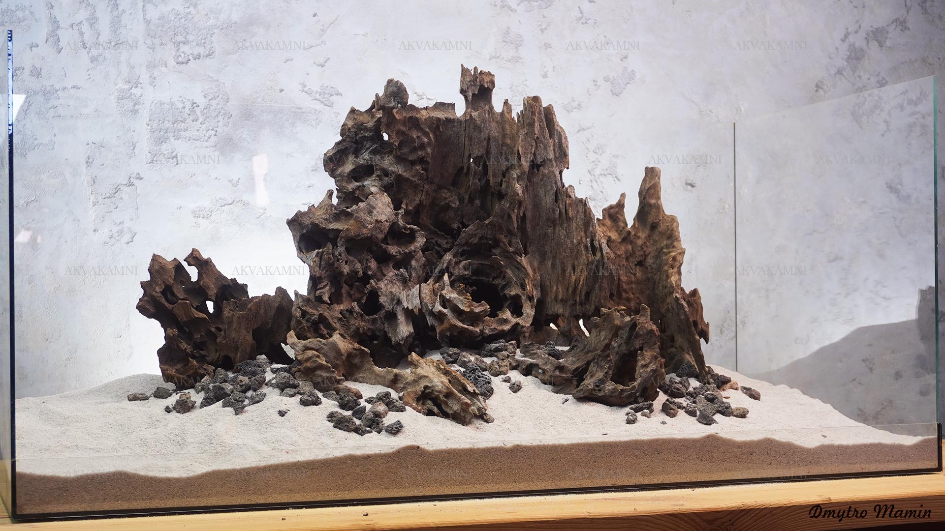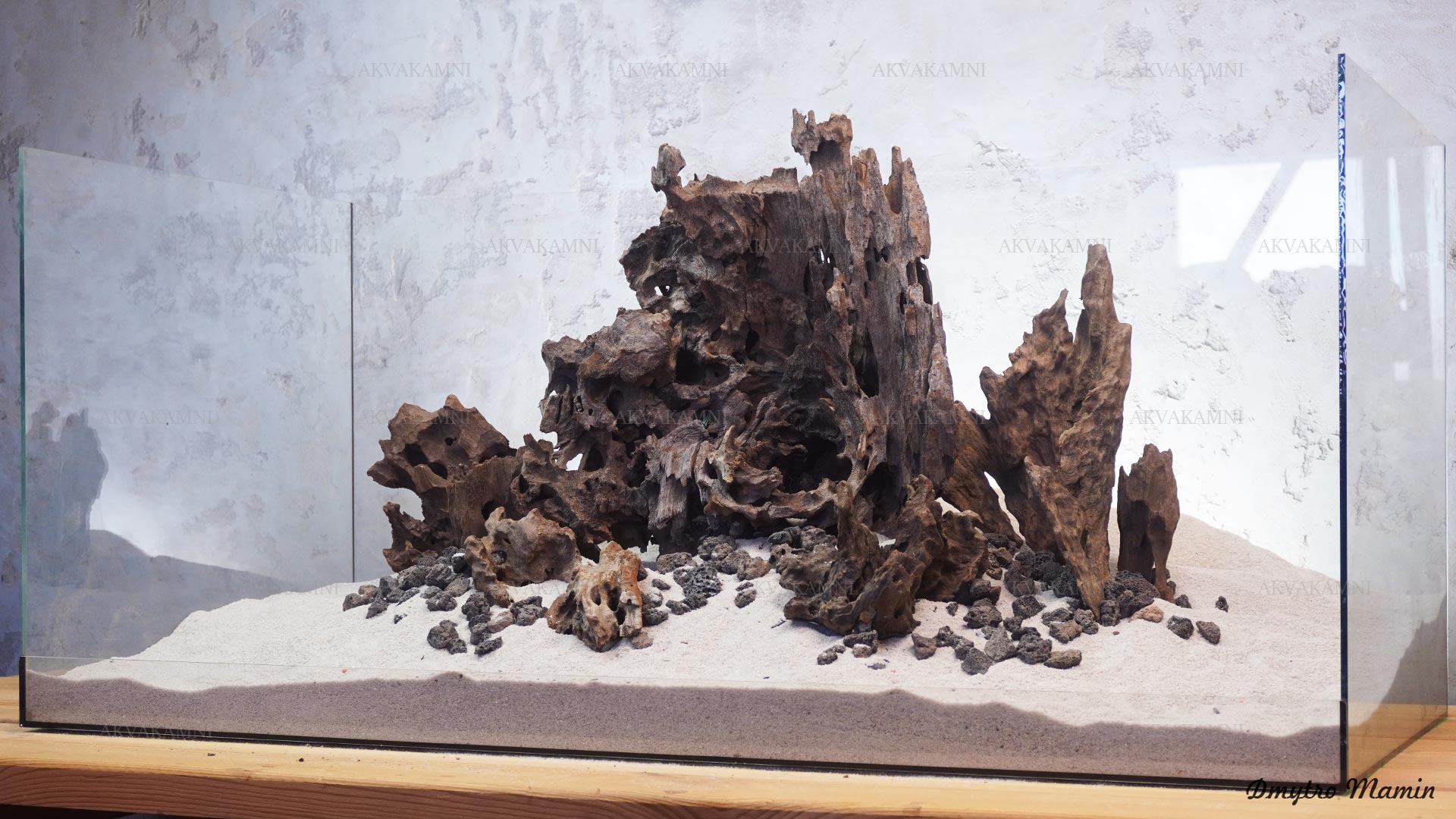 Композиція з каменю та корчів Лабіринт. Перед використанням корчі потрібно втопити на кілька днів, щоб вони наситилися та тонули. Корчі спочатку мінімально підфарбовуватимуть воду. У цьому немає нічого страшного для риб та води, але якщо Вам не подобається колір, корчі можна вимочити довше, або додати спеціальне вугілля у фільтр.