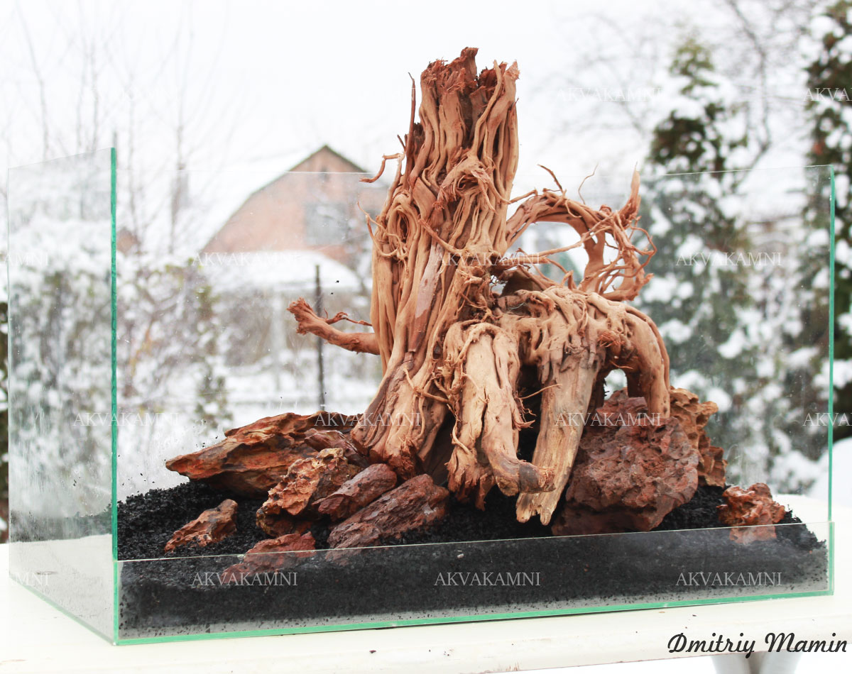 Композиция из камня и коряг. Перед использованием коряги достаточно просто промыть. Однако не забывайте, что коряги не будут сразу тонуть и будут подкрашивать воду. В этом нет ничего страшного для рыб и воды, но если Вам не нравится цвет, коряги можно вымочить или проварить.