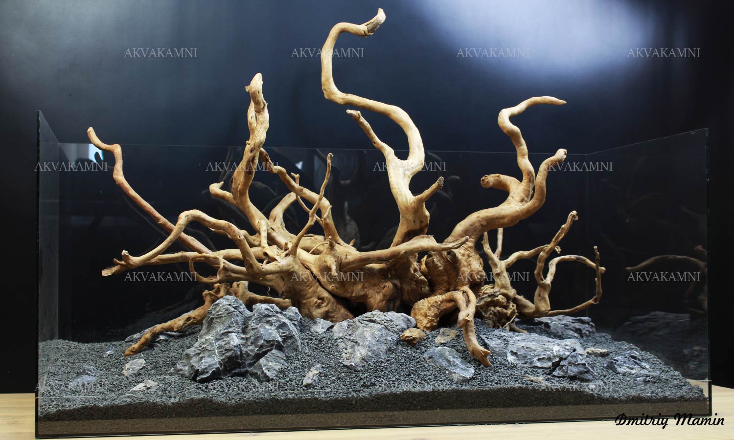 Композиция из камня и коряг. Перед использованием коряги достаточно просто промыть. Однако не забывайте, что коряги не будут сразу тонуть и первое время будут подкрашивать воду. В этом нет ничего страшного для рыб и воды.