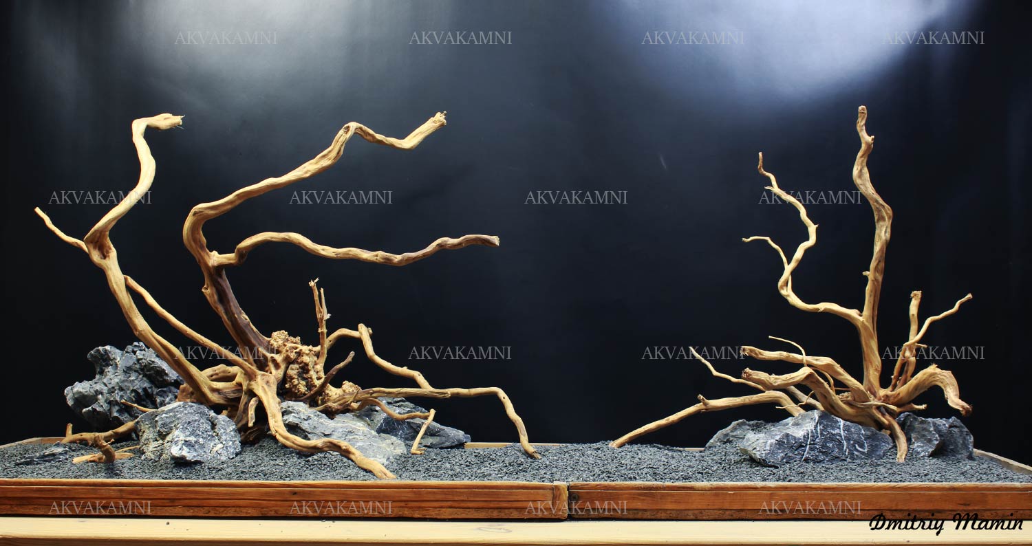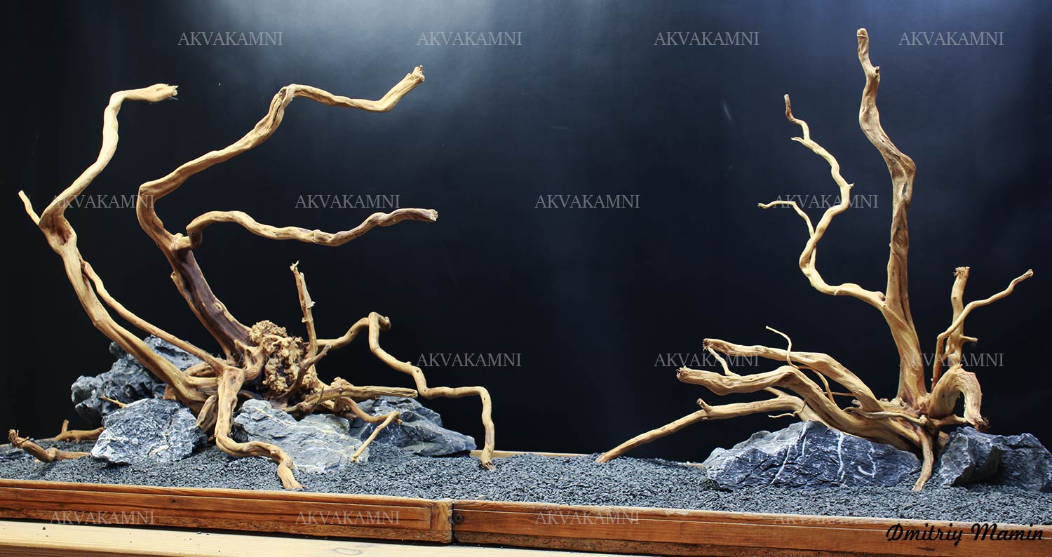 Композиция из камня и коряг. Перед использованием коряги достаточно просто промыть. Однако не забывайте, что коряги не будут сразу тонуть и первое время будут подкрашивать воду. В этом нет ничего страшного для рыб и воды.