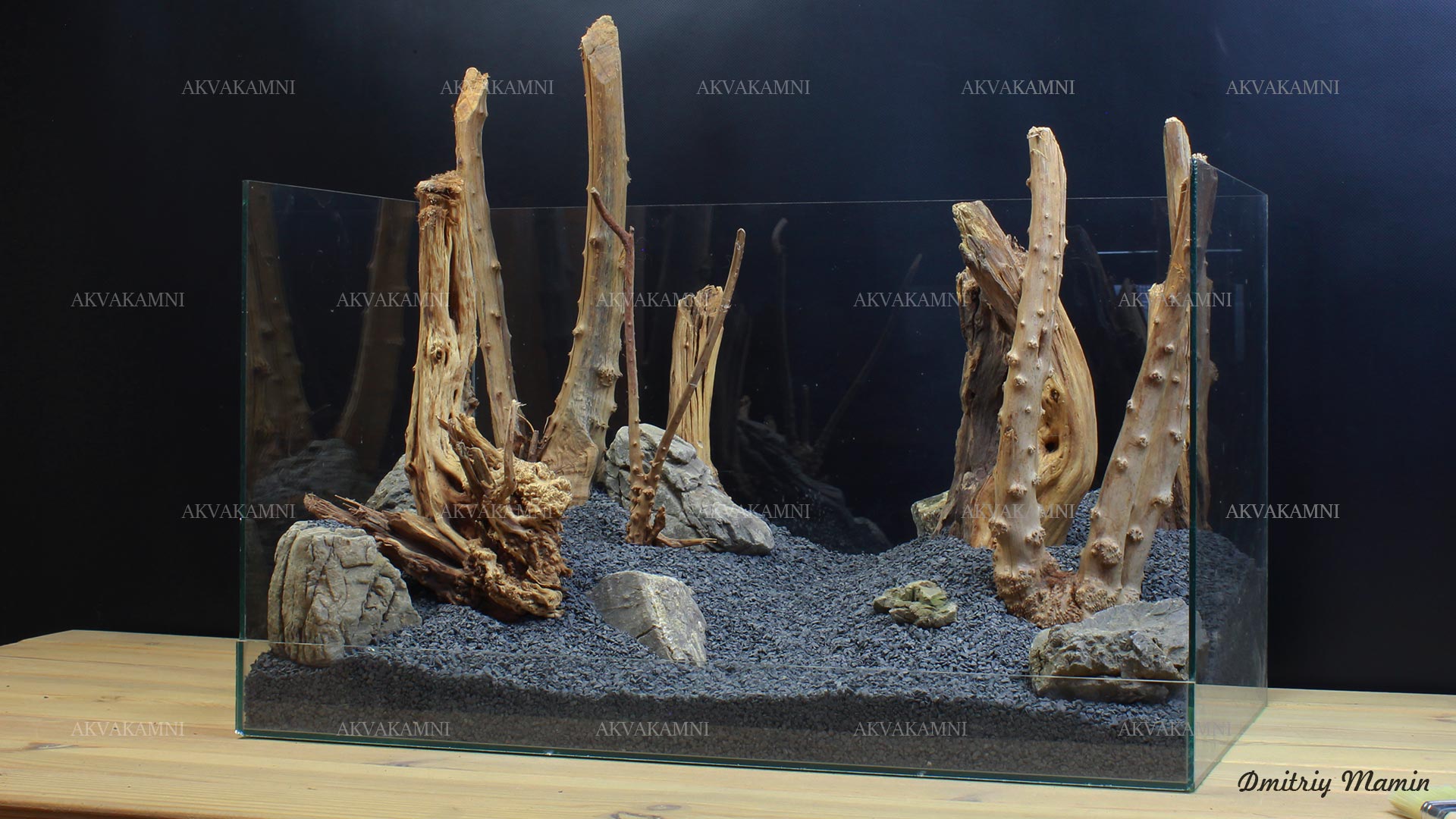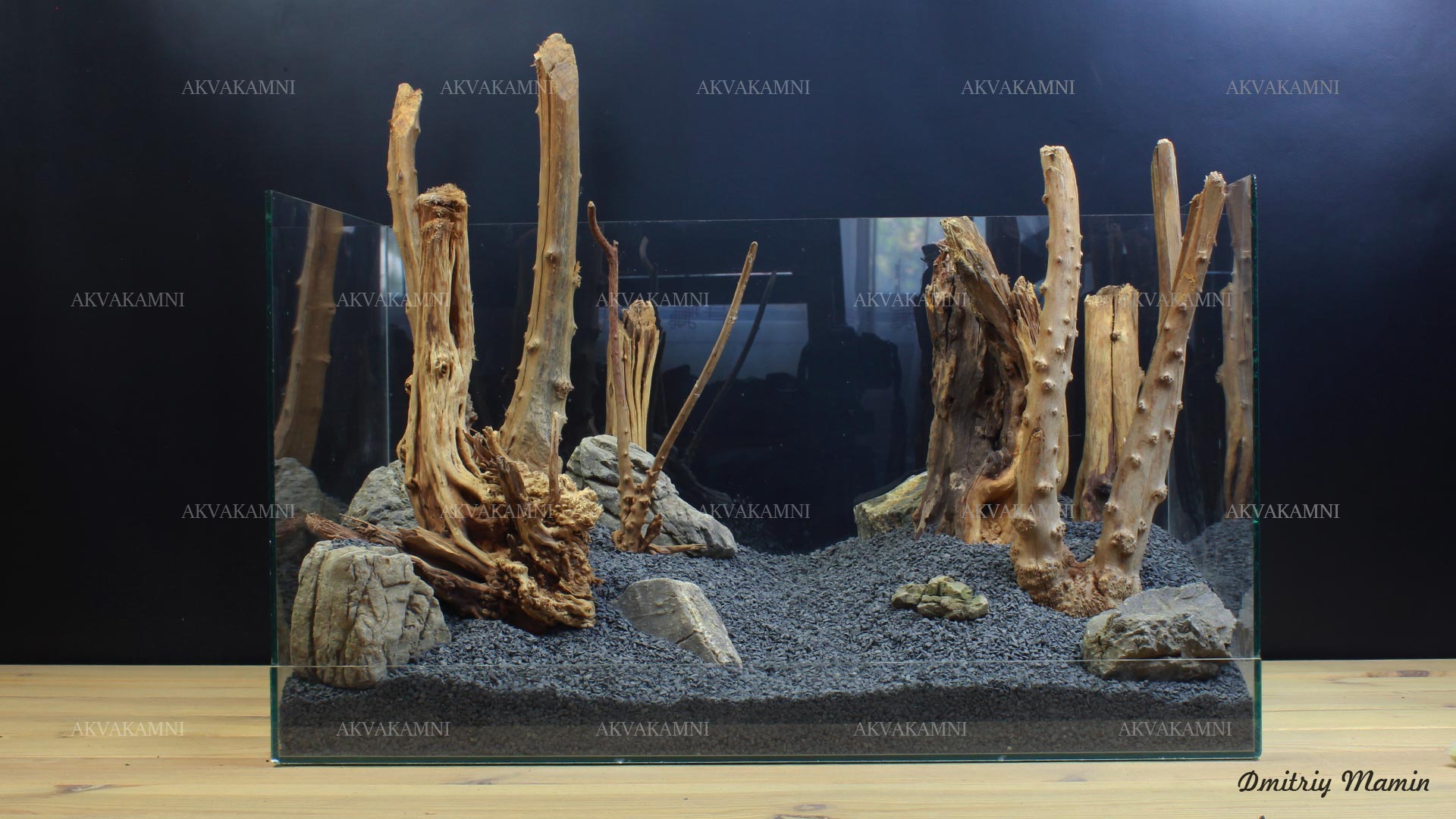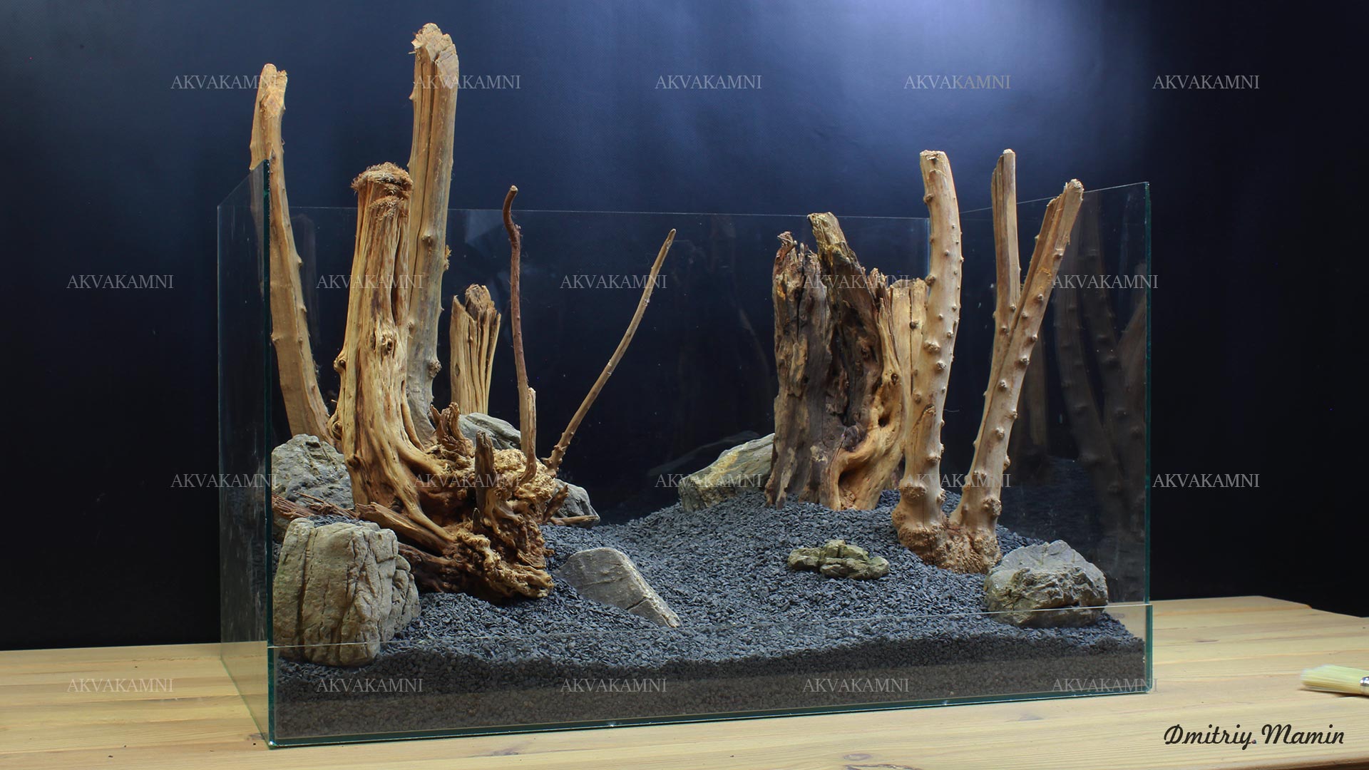 Композиция из камня и коряг. Перед использованием коряги достаточно просто промыть. Однако не забывайте, что коряги не будут сразу тонуть и первое время будут подкрашивать воду. В этом нет ничего страшного для рыб и воды, но если Вам не нравится цвет, коряги можно вымочить или проварить.
