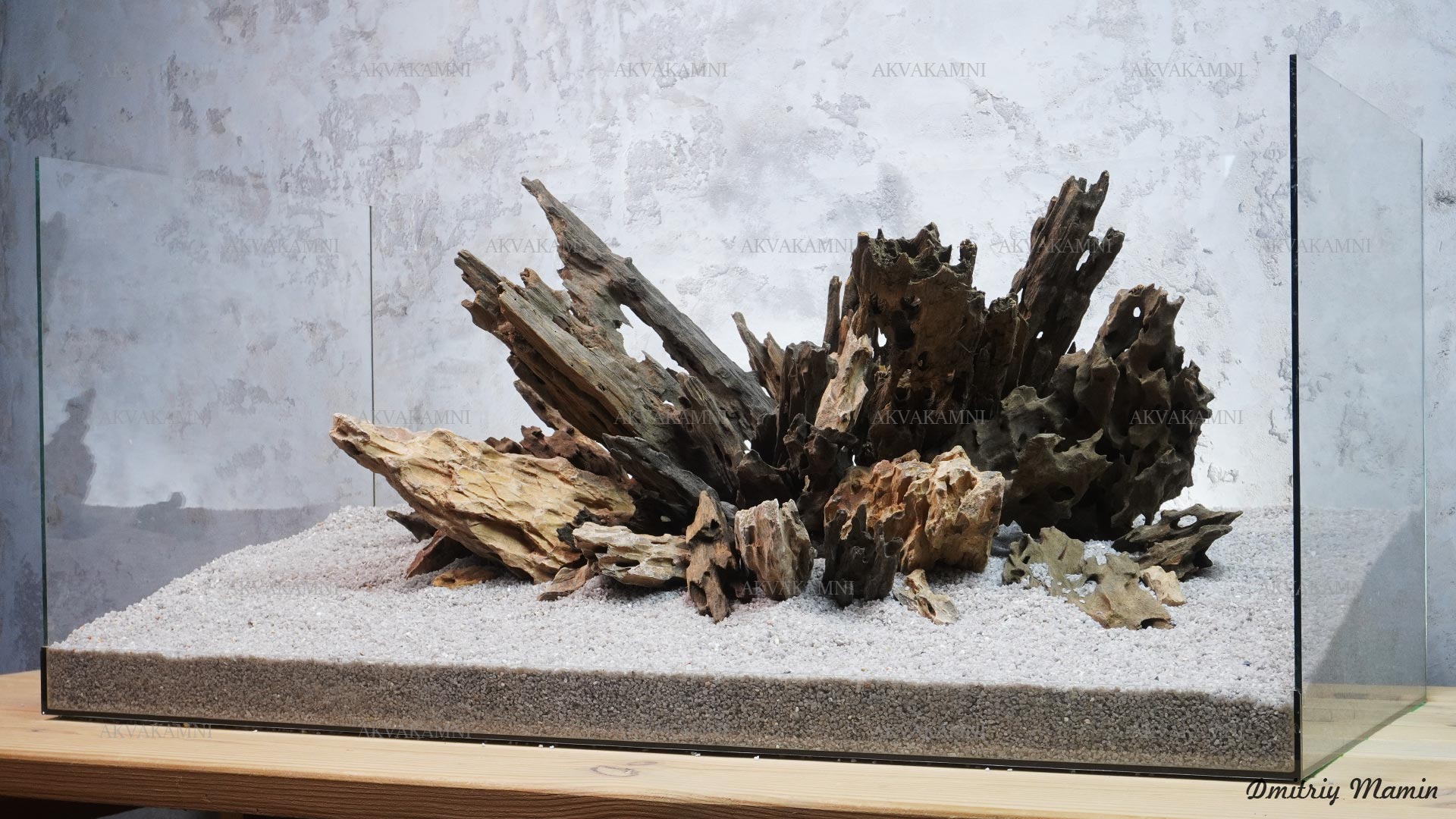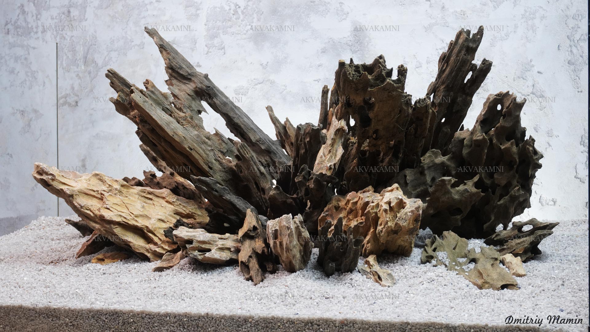 Композиция из камня Дракон и коряг Лабиринт. Перед использованием коряги нужно утопить на несколько дней, чтобы они напитались и тонули. Коряги первое время будут минимально подкрашивать воду. В этом нет ничего страшного для рыб и воды, но если Вам не нравится цвет, коряги можно вымочить дольше или добавить спец. уголь в фильтр.