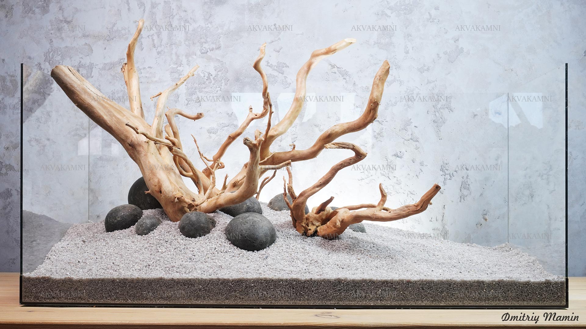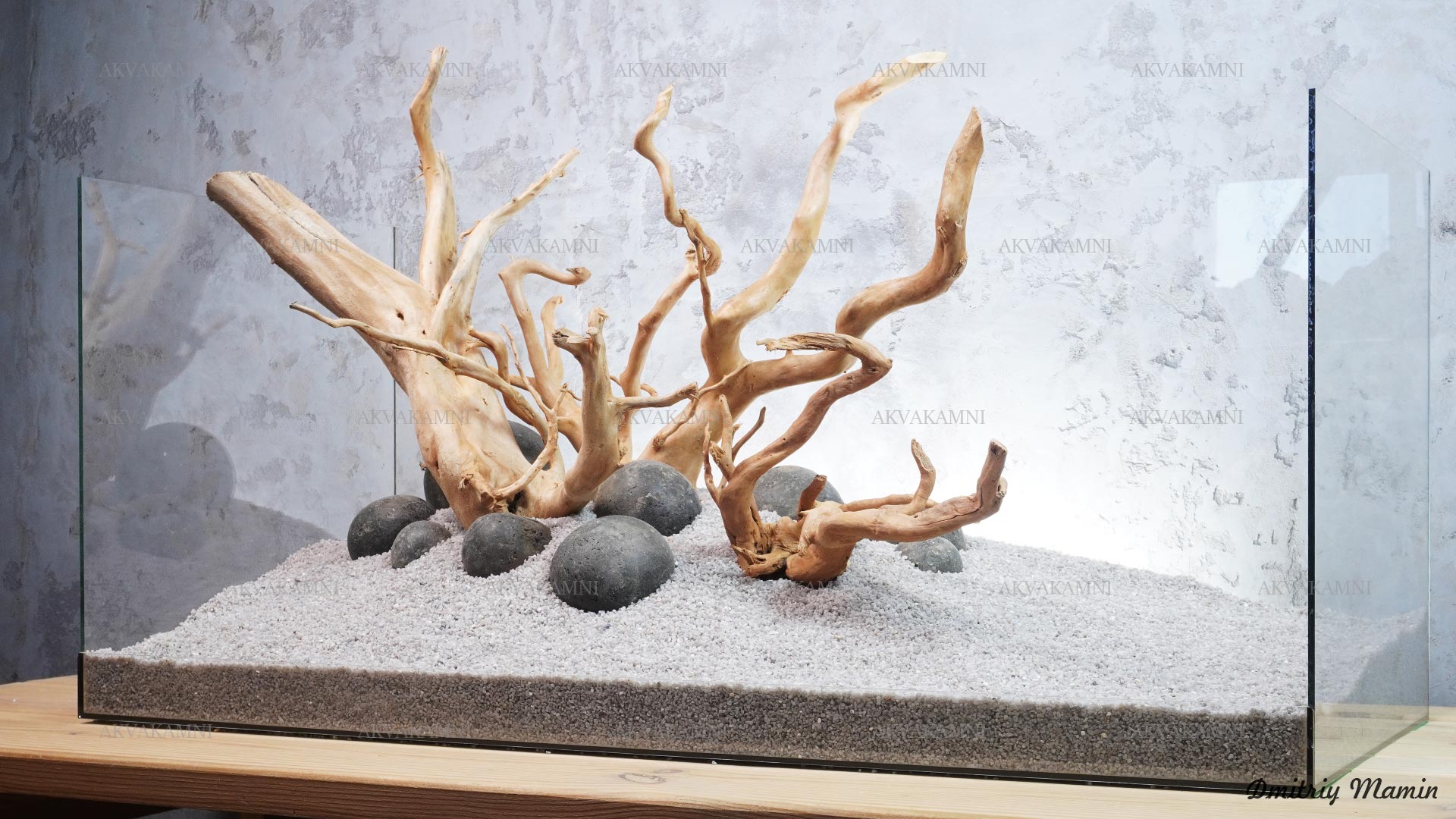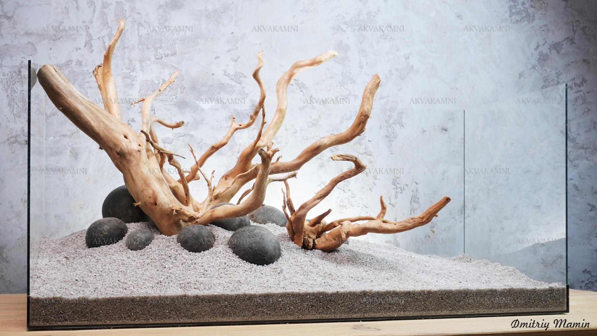 Композиция из камня и коряг. Перед использованием коряги достаточно просто промыть. Однако не забывайте, что коряги не будут сразу тонуть и первое время будут подкрашивать воду. В этом нет ничего страшного для рыб и воды.