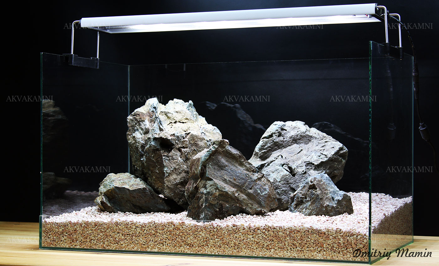 Композиция из натурального камня "Карелия". Этот вид камня отлично подходит для создания классического Iwagumi. У камня "Карелия" очень приятный темно-зеленый цвет и хорошие формы для создания композиций.