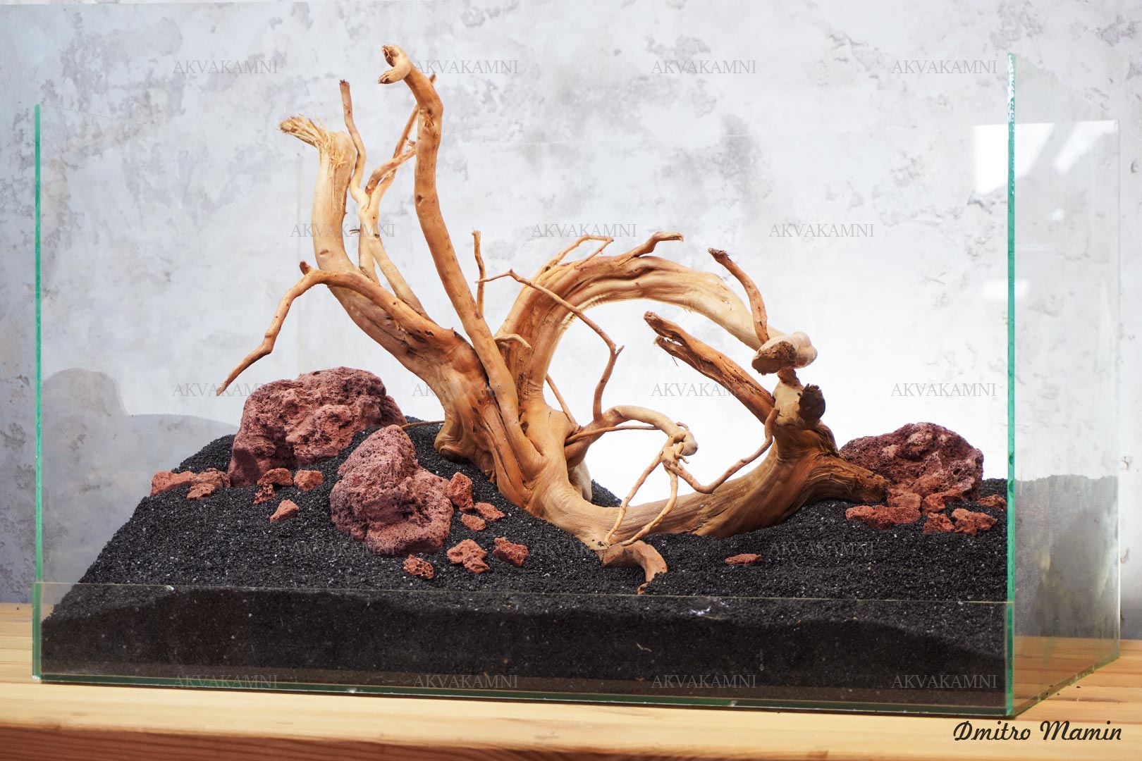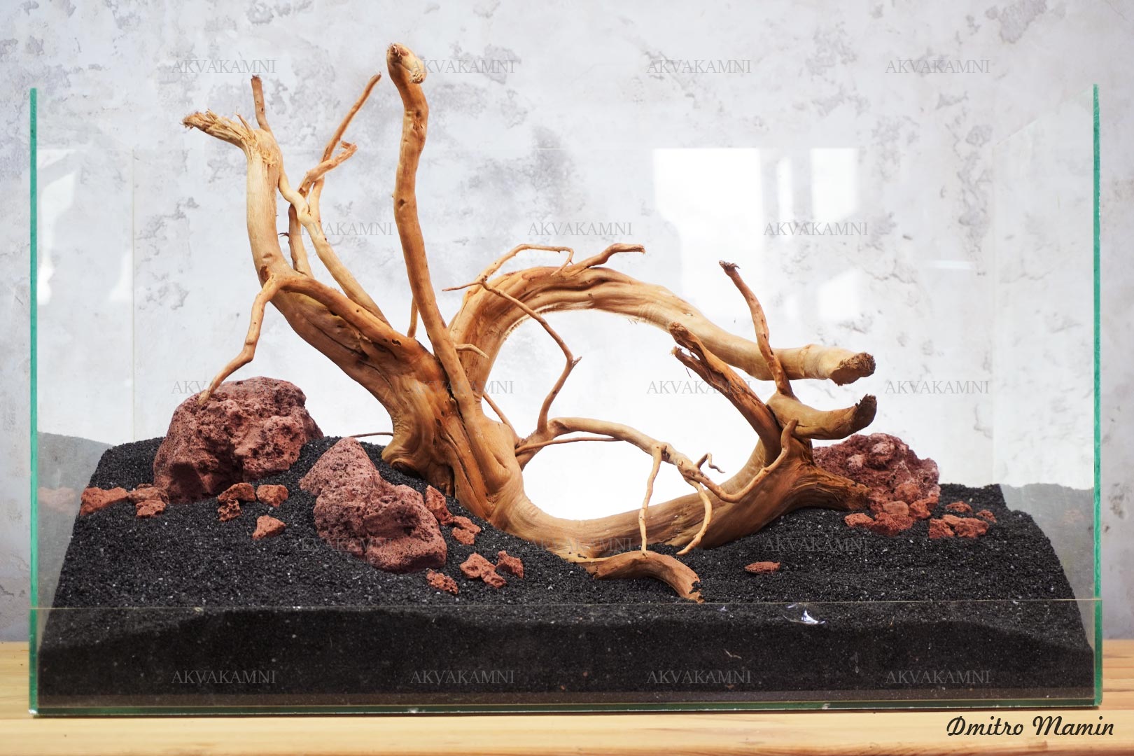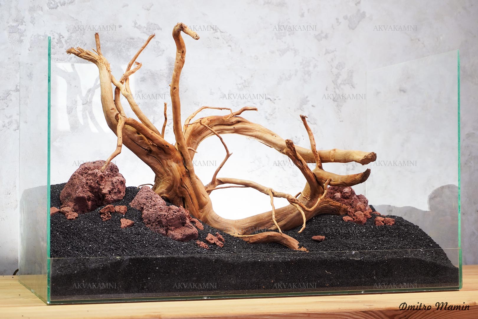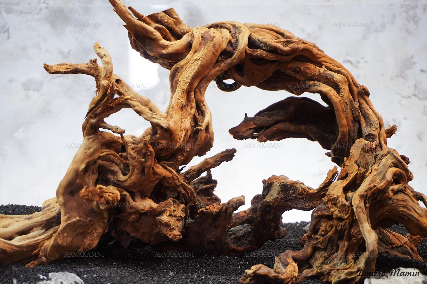 Композиция из камня и коряг. Перед использованием коряги достаточно просто промыть. Однако не забывайте, что коряги не будут сразу тонуть и первое время будут подкрашивать воду. В этом нет ничего страшного для рыб и воды.