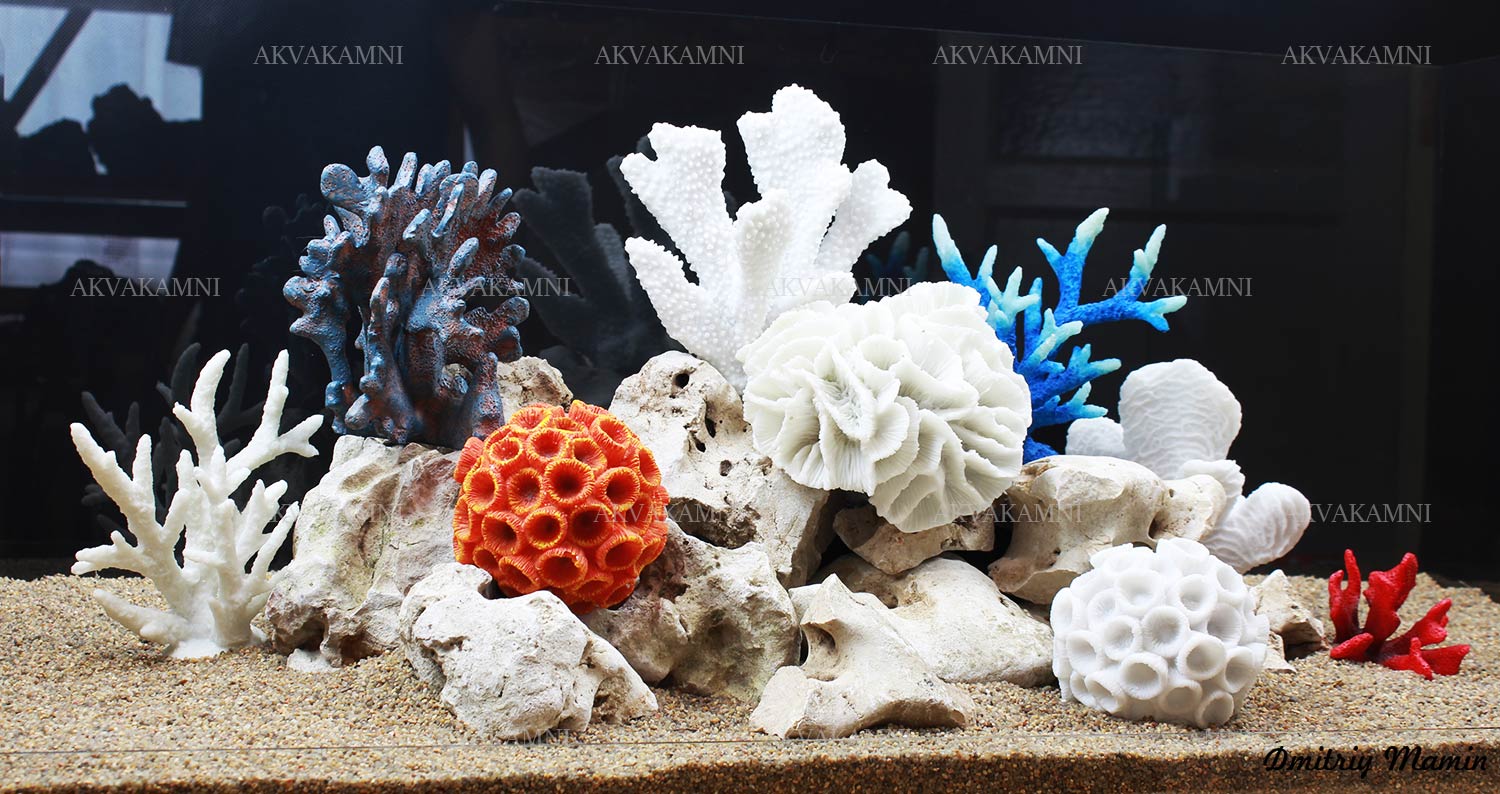 Композиция из кенийского камня. Камень идеально подходит для аквариума с цихлидами за счет своих форм и цвета. В основе композиции находится вулканическая лава для облегчения композиции. Кораллы из нейтральной смолы, безопасны для аквариума и обитателей.