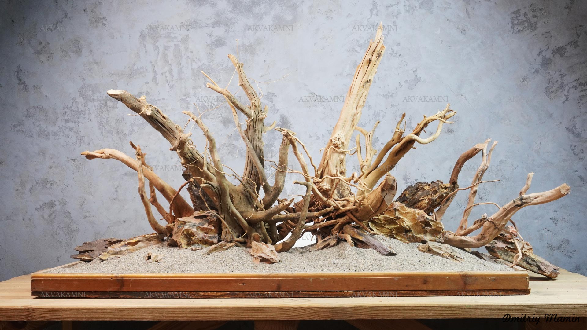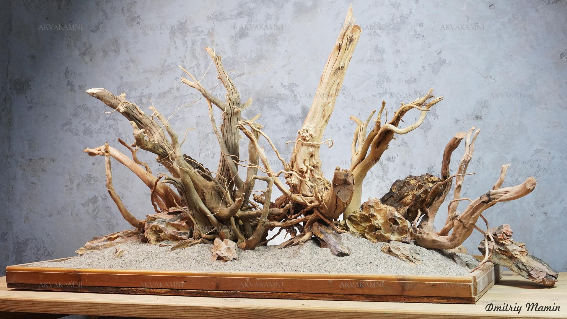 Композиция из камня и коряг. Перед использованием коряги достаточно просто промыть. Однако не забывайте, что коряги не будут сразу тонуть и первое время будут подкрашивать воду. В этом нет ничего страшного для рыб и воды.