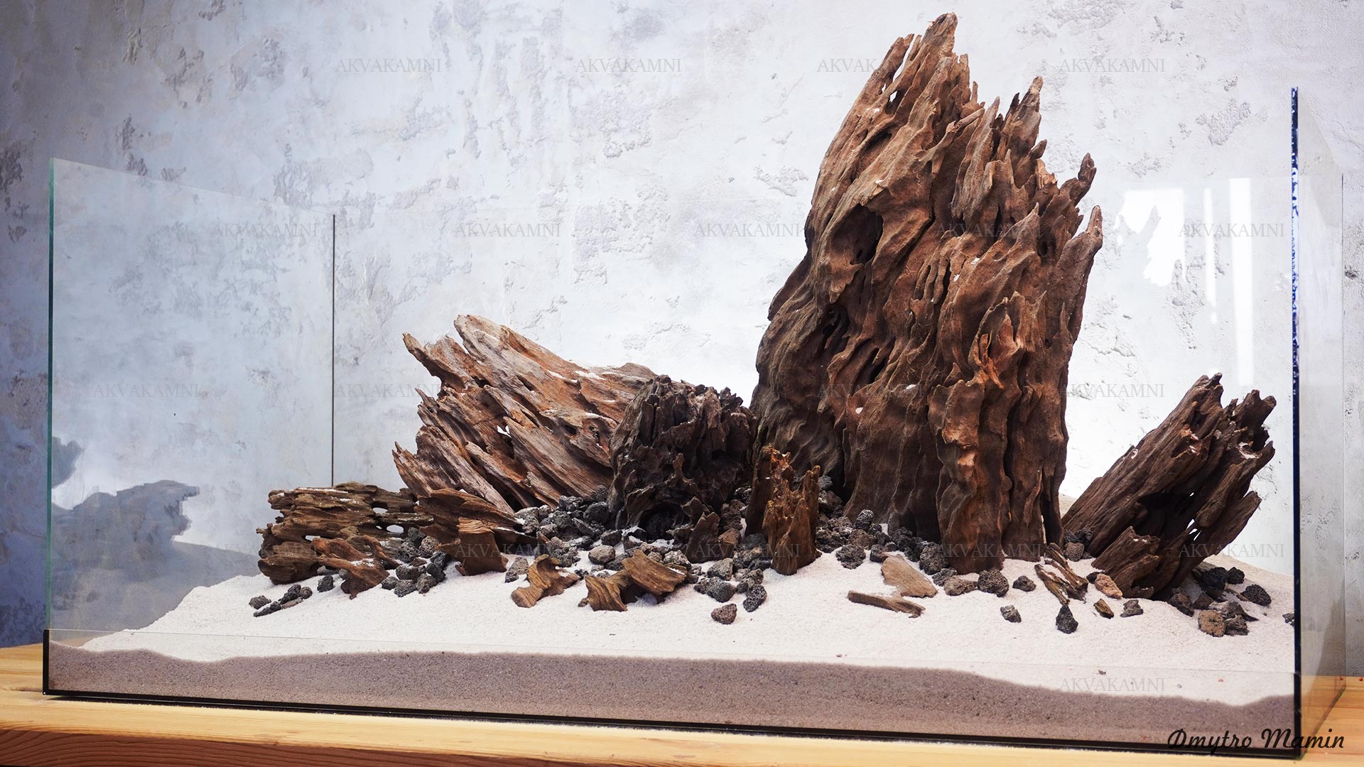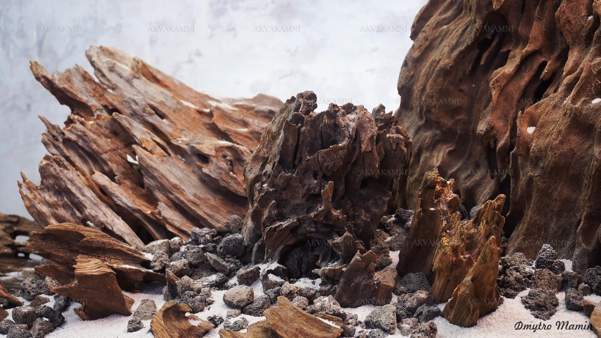 Композиція з каменю та корчів Лабіринт. Перед використанням корчі потрібно втопити на кілька днів, щоб вони наситилися та тонули. Корчі спочатку мінімально підфарбовуватимуть воду. У цьому немає нічого страшного для риб та води, але якщо Вам не подобається колір, корчі можна вимочити довше, або додати спеціальне вугілля у фільтр.