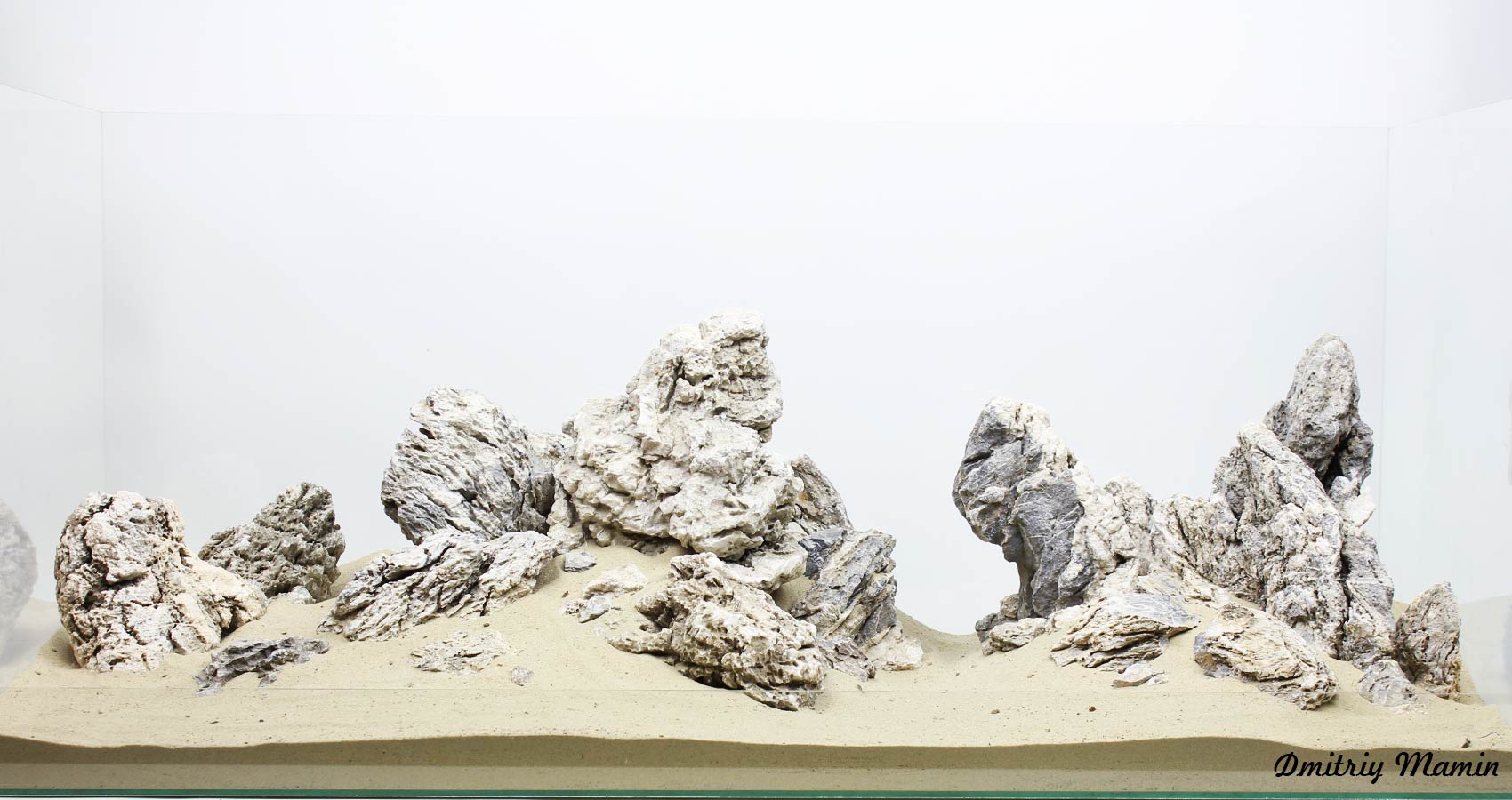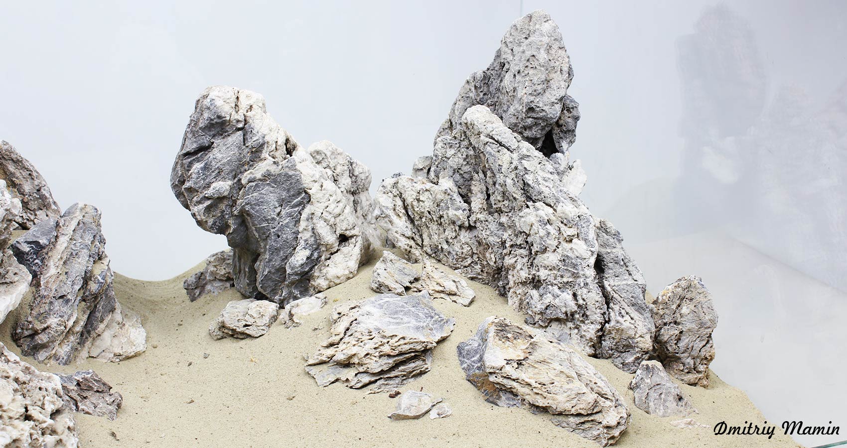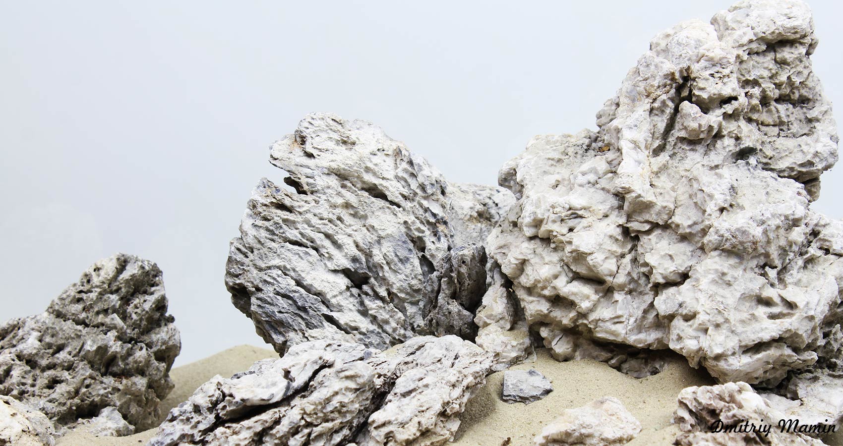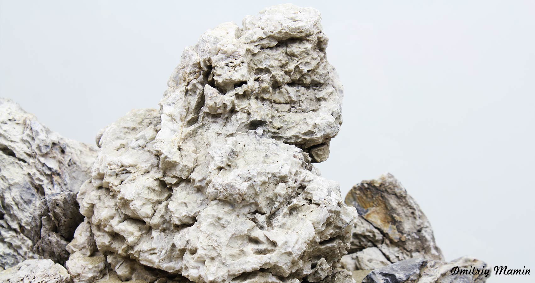 Из тонн камня камня "Черный кварц" было отобрано около 30 кг уникального, необычного камня белого цвета. Камень состоит в основном из белого нейтрального кварца с вкраплениями серого камня этой же породы. В этой композиции собраны лучшие камни по фактуре и внешнему виду.