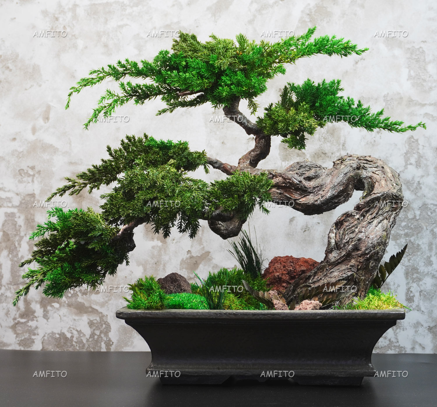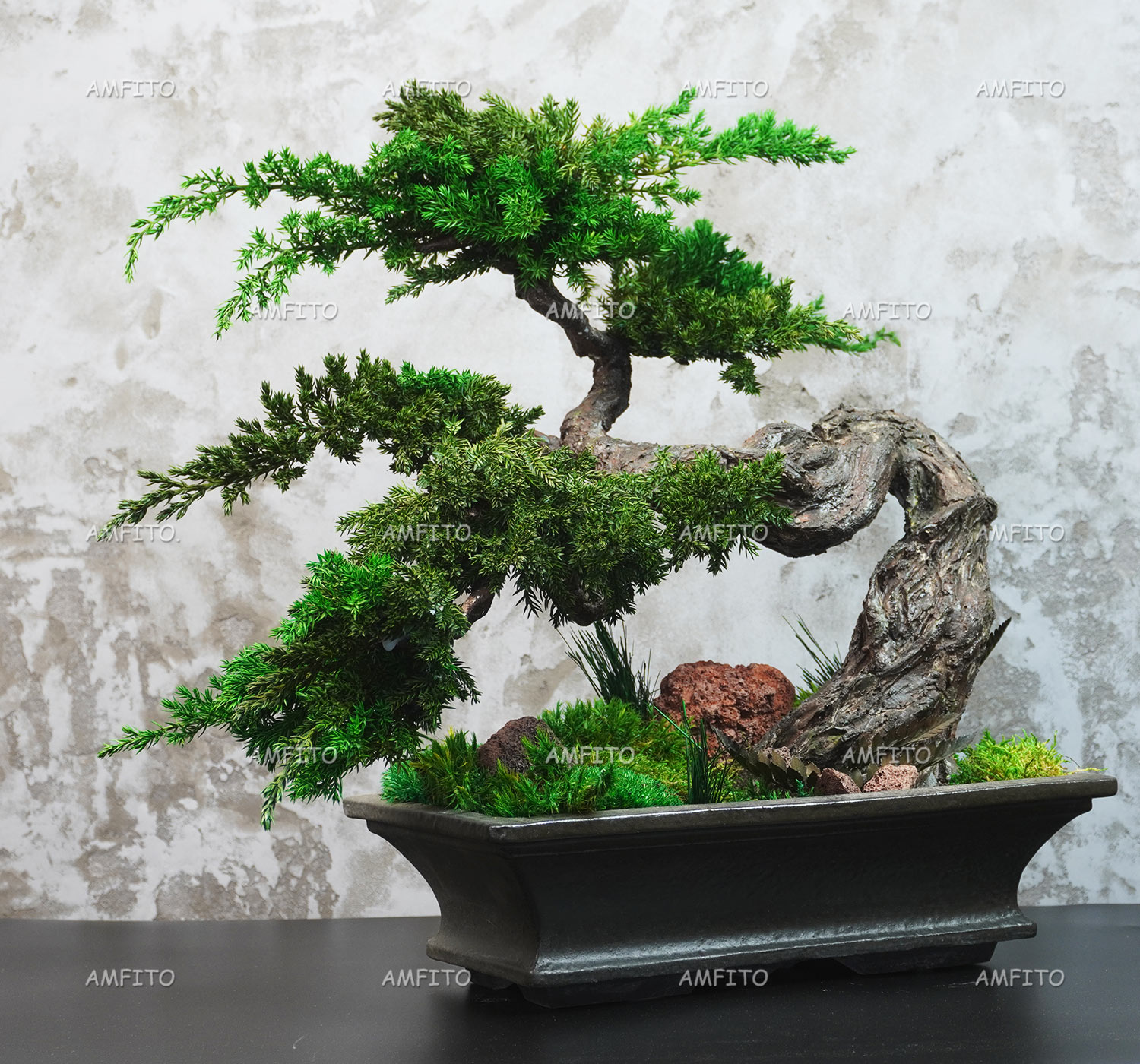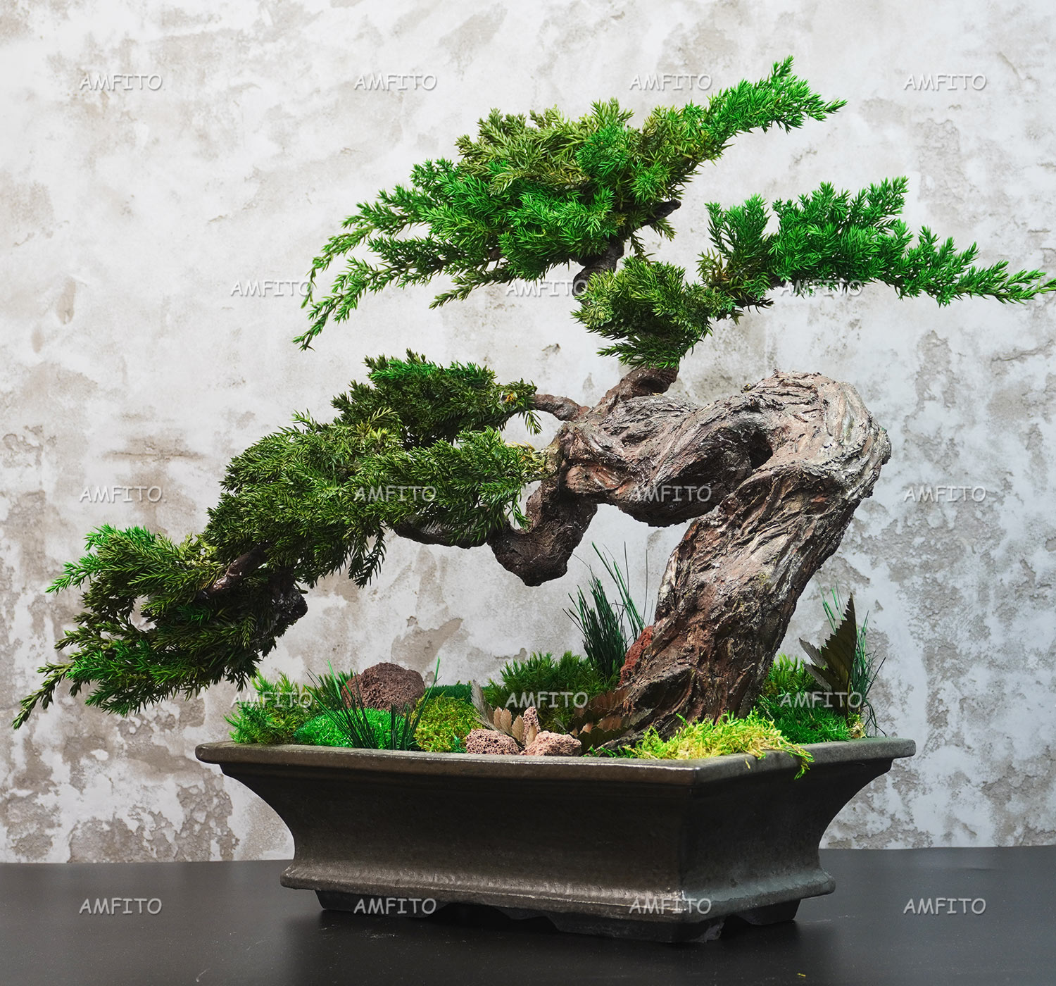 Природная композиция из стабилизированных растений. Хвойный бонсай, мох, камни вулканической лавы и небольшие декоративные растения.
